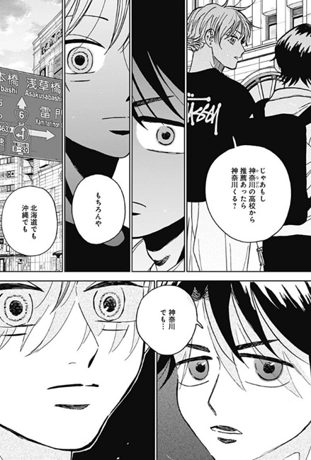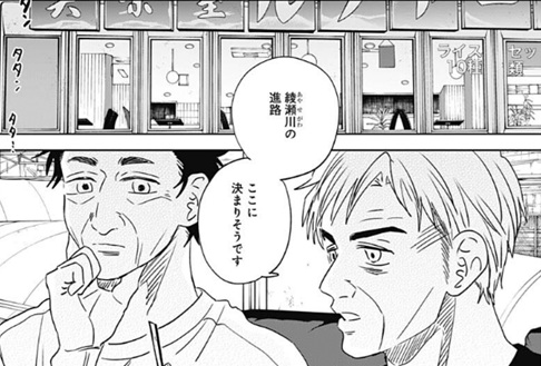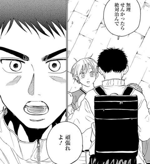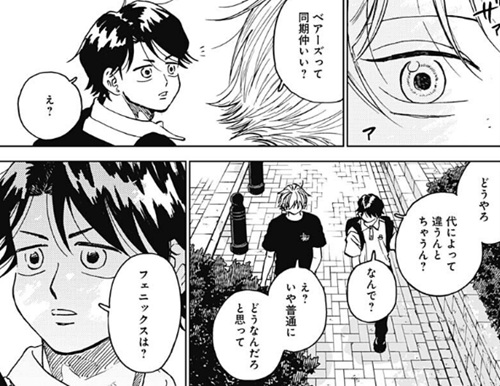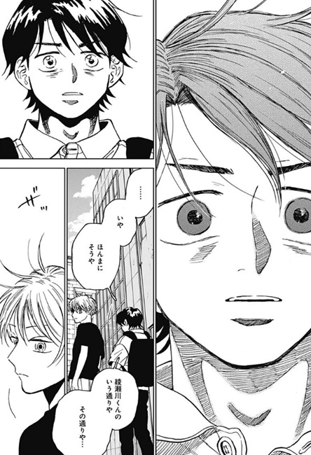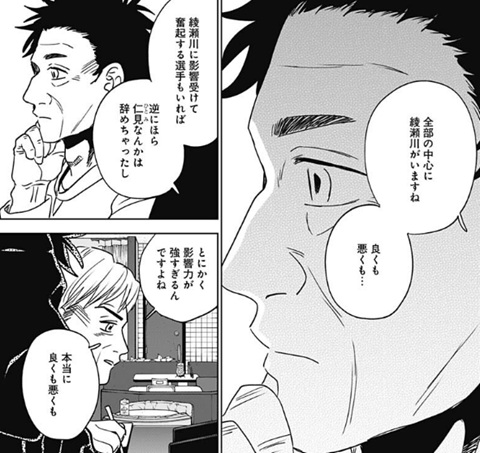 ヤングジャンプ感想:ダイヤモンドの功罪 第87話 祝・ダイヤモンドの功罪 連載再開!! いや今日はヤングジャンプ見てぶったまげましたわ、ここ数ヶ月ずっと休載に入っていたダイヤモンドの功罪が ついに念願の連載再開になったっていう。休載の理由についてはよくわかってませんが、 とりあえず今回真っ先に思ったことは続きが読めてよかったって嬉しい感情でしょうか 世の中の漫画ってある日突然プツッと切れて、そこで突然終わってしまうこともあるから 俺としてはそういうのがたまらなく寂しいので、ダイヤモンドの功罪の続きが始まったっていうのは素直に嬉しいですね そんな再開の扉絵では謎の知らない男がアップになってますが、俺はこれって平井先生が描きたいものは別にあると思ってて その描きたいものっていうのが何かというと これですよ。そう、前回の話の扉絵とくっつけると大きな1枚絵が完成するようになっており、 今回の扉絵でドアップに映ってるように見えた謎の男っていうのは単なる通行人だろうなっていう。 で、なんでわざわざこんな大きな一枚絵の雷門を描いたのかっていうと、 雷門の左右に風神・雷神の像があり、そこに綾瀬川と大和がそれぞれ立ってるっていうね たぶん平井先生が本当に描きたいのはこれです。 編集の文章も、綾瀬川に対して「雑踏、ただひとり」、大和に対して「雑踏、ここにもひとり」と書かれているので 手前に映っている大勢の人達は、雑踏を歩いている単なる通行人たちで、本当にここで描写したいものは 風神・綾瀬川と雷神・大和っていうね。いやはやなんというか 再開1ページ目から考察カロリーたけぇなおい!?(えー いやマジで、今回の扉絵を見て「作者が本当に描きたいものは風神・綾瀬川と雷神・大和だろう」ということに気付いた人間、果たして俺以外にどれだけいるんだろうか なにしろ前回の扉絵が載ったのが数ヶ月前のヤングジャンプだから、今回の扉絵と繋がってることに気づくかどうかが至難の業だしな… ちなみになんで俺が気付いたのかというと、前回の扉絵が載った時に 「綾瀬川こんなとこで何してんの?」っていうネットの書き込みがあって、それを覚えてたんですよね 前回の扉絵だけを見ると、綾瀬川が風神の像の前で一人ポツンと立ってるっていう謎のイラストになってたから その謎が気になってネットに書き込んだ人がいて、それを見て俺も「確かに気になるイラストだな」って今まで覚えてたってわけですね ありがとうネットに書き込んだどこかの人!(えー それがなければ俺も気づかずにスルーしてただろうなー 「綾瀬川くん、野球辞めるん?」 さあそして本編の方を見ていくと、前回ラストで大和がこの衝撃の質問をしたシーンで続いてたんでしたっけね 綾瀬川は野球をやめてしまうのかどうかっていう。最近の綾瀬川としては、野球をしていても嫌な出来事ばかりで確かにやめてしまうかも…という状況でしたが まあでも今回の扉絵見たら辞めるってことはないやろな(えー なにしろ風神・綾瀬川と雷神・大和で並び立ってるんやで!?そこからいきなり綾瀬川だけ欠けるなんてことはないやろ!? 「なんで?大和に関係ある?」 「もしほんまに辞めてまうならちゃんと話しとこうと思っててん。 お互い嫌な思いしたまま…いや、僕のためやな。 僕があのままいつもの違う感じで終わりたくなかってん。 せやし、休みやのに来てくれてありがとう」 って、野球を辞めるのかという質問に対して「お前に関係あんの?」とメチャメチャ冷たい言葉で返す綾瀬川ですが、 しかしそれにも動じずに飄々と答える大和。ほんと大和のスルースキルすごいな そして大和としては、もし綾瀬川がここで野球を辞めるとしたら気まずくなった関係のまま別れることになってしまうので それだと後味が悪いから、今のうちに話せることを話してスッキリした関係にしたいっていうことみたいですね って、そんな大和の話を聞いてる最中、 「受け入れた!」と言ってる円(まどか)の姿を思い出して、急に態度が優しくなり始める綾瀬川。 え、なんでここで円?なんでいきなり「うんわかった、オレもごめんね」って優しくなるんだ?って正直戸惑ったんですが この「受け入れた!」と言ってる円のシーンがいつだったのかを確認してみると これがそうですね。第70話で円と綾瀬川が再会した時のシーン。 |
