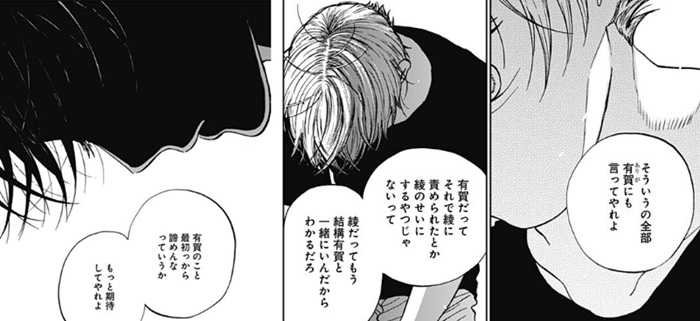 ヤングジャンプ感想:ダイヤモンドの功罪 第86話 さてダイヤモンドの功罪86話の感想ですが、今回の話は前回ラストで再会した綾瀬川と大和のやりとりが描かれる内容となってますね 顔を合わせるなり「綾瀬川くん来てくれてありがとう」と挨拶する大和ですが めちゃくちゃ他人行儀な会話やな!? たとえば気安い友達だったら「ういーっす」とかテキトーな挨拶でもいいだろうに わざわざ丁寧な挨拶をするっていうのは、やけに距離感あるような気がするな… 「どっか座れるとこ行こうよ」 「そやな、ありがとう。そのズボンええな、涼しそうやなぁ」 「あぁ、これ?バスパン。バスケの時はくやつ」 「へええ、おしゃれやな〜。わざわざ来てくれてありがとう」 「うん」 そして綾瀬川と落ち着ける場所で話すことになった大和ですが…いやちょっと待ってください大和のやつ どんだけありがとう連発してんねん!?(えー 「綾瀬川くん来てくれてありがとう」「そやなありがとう」「わざわざ来てくれてありがとう」って怒涛の3連発やで!? しかも綾瀬川の履いてるなんでもなさそうなズボンを見て「そのズボンええな、おしゃれやな」と言ったりだとか 大和お前あれだろ!綾瀬川のご機嫌取り作戦を考えてるだろ!(えー いやマジでその線はあると思うんだよな。なにしろ綾瀬川と大和はこないだすごい険悪な空気になってしまったし その空気をやわらげるために、今回はなんとか綾瀬川の機嫌を直そうとしてるっていうのが大和の考えなんじゃなかろうか 「明智さん謝っとったで、綾瀬川くん怒ってたやん。 綾瀬川くんが僕のこといじめてるみたいに見えるて、明智さんが言うててんな」 おっとそして、明智が綾瀬川を怒らせてしまった失言のことを謝っていたと伝える大和! ご機嫌取り作戦もいよいよ大詰めだな!(えー なにしろ綾瀬川の機嫌が悪くなってしまった原因というのがまさにその明智の失言なわけだから 明智がそれを謝っていたというのはご機嫌取り作戦の最大の切り札と言えるでしょう ありがとう3連発作戦に始まり、ズボンおだて作戦、そして明智の謝罪作戦と一気に畳みかけたわけですが、果たして綾瀬川の機嫌は… ぜ、全然よくなってねえええ〜〜〜!! まるっきり機嫌よくなってねえええええ!!必死のご機嫌取り作戦もむなしくクソ不機嫌そうに「怒ってないけど?」などと言い出す綾瀬川! 大和としては冷や汗を流しながら「こ、ここまでやってもアカンのか…」と思っていることでしょう なんていうか綾瀬川ってあれよな、揉めてしまった相手に対してはまったく心を開かなくなるタイプよな 揉めたことをきっかけに心のシャッターがピシャンと閉まってしまい、その相手に対してはもう心のシャッターを開けることはないっていう。 これまで桃吾、イガ、時生、大和と次々にそうなってしまってる気がするわ… そう考えると、真夜が最近イガに対してアドバイスしていた 「ちゃんとぶつかってけよ」っていうのは、綾瀬川には完全に逆効果だと思うんだよな たぶん真夜たちはお互いにぶつかって揉めたりケンカしたりしながら、それを乗り越えて絆を深めた経験があるんだろうけど 綾瀬川にそれをやった場合、完全に心を閉ざされて関係がみるみる悪化していくから 真夜たちのようにぶつかってもダメだと思うんだよな…それに関しては時生もついこの前、 綾瀬川にぶつかっても全然うまく行く気がしないと言ってましたがその認識は正しかったんじゃないかな 「他の人にも言われててん、自分がどう見えるか考えやって。 僕綾瀬川くんと話しとって、綾瀬川くんがどう見られるか考えたことなかってん。 そういうの気ぃつかへんでごめんな」 「…」 って、まだ機嫌のよくならない綾瀬川に対し、「僕も気がつかなくてごめん」と自分の至らなさも謝る大和! お前どんだけいいヤツなん!? この大和のいいヤツぶりは本当にやばいですよ、なにがそんなにやばいって そもそも綾瀬川がキレたのって大和は全然なんも悪くないですからね 綾瀬川がキレてしまった原因って、この明智の失言が原因なわけですが |