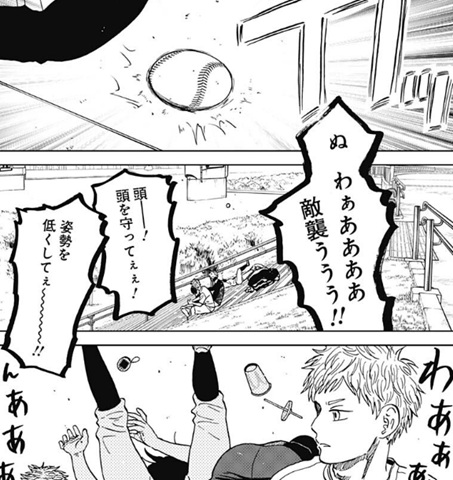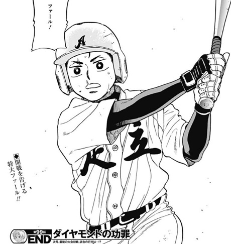 ヤングジャンプ感想:ダイヤモンドの功罪 第99話 さてダイヤモンドの功罪99話の感想ですが、今回の話は時生の成長痛のことが仲間たちにすっかりバレている場面で始まってますね 前回まで時生はヒデ以外の仲間たちに成長痛のことは隠しており、そのまま大会に出ようとしていたわけですが 今回すっかりバレており大会にも出れず、「隠しといてバレんのダッサ」「かっこつけたかったんすね」などと言われております いいぞお前ら!もっと言ってやれ!(えー 特に「かっこつけたかった」っていう一言にはなるほどと思いましたね というのも、成長痛を隠していた理由について時生は「綾瀬川の力になりたかったから」と言ってたわけですが そんなわけないやろと俺は全然信じてなくて、絶対他の理由だわと思ってたわけですよ 「かっこつけたかった」はその理由として結構しっくりくるっていうかね というのも、ケガを隠して痛みに耐えながら大会に出場するって、いかにもかっこいい奴じゃないですか そんな風にかっこつけたかっただけじゃねーのか時生くんよぉ!(えー そして時生の嘘がバレた理由についてですが、監督が医者に連絡を取って本当のことを知り 「とても大会に出せる状態じゃない」と判断して、みんなにも公表し時生の出場を止めたようです いいぞ監督!あんたが大将!いよっ大統領!(えー 時生の嘘に惑わされずに本当の情報を確認して、監督として責任ある判断を下したっていうのは立派なもんですね これに懲りて嘘をつくなんていう生き方はもうやめな時生!嘘っていうと軽い言葉に聞こえるけど やってることは事実の隠蔽と捏造ですからね 嘘をつくことをやめられない人間が結局そういう不祥事を起こす汚い大人になるわけで 嘘なんかに頼らずにまっとうな方法で生きることを身に着けていくべきなんですよ まぁこの監督も普段は嘘つきなのがなんとも言えねーところだけど…(えー そんな中、綾瀬川たちの試合が始まる時間となりますが、今日の試合には見物人としてシニアの先輩たちが次々にやってきていました そんな中、観戦していた先輩たちを急襲するように飛んできた鋭い当たり! |